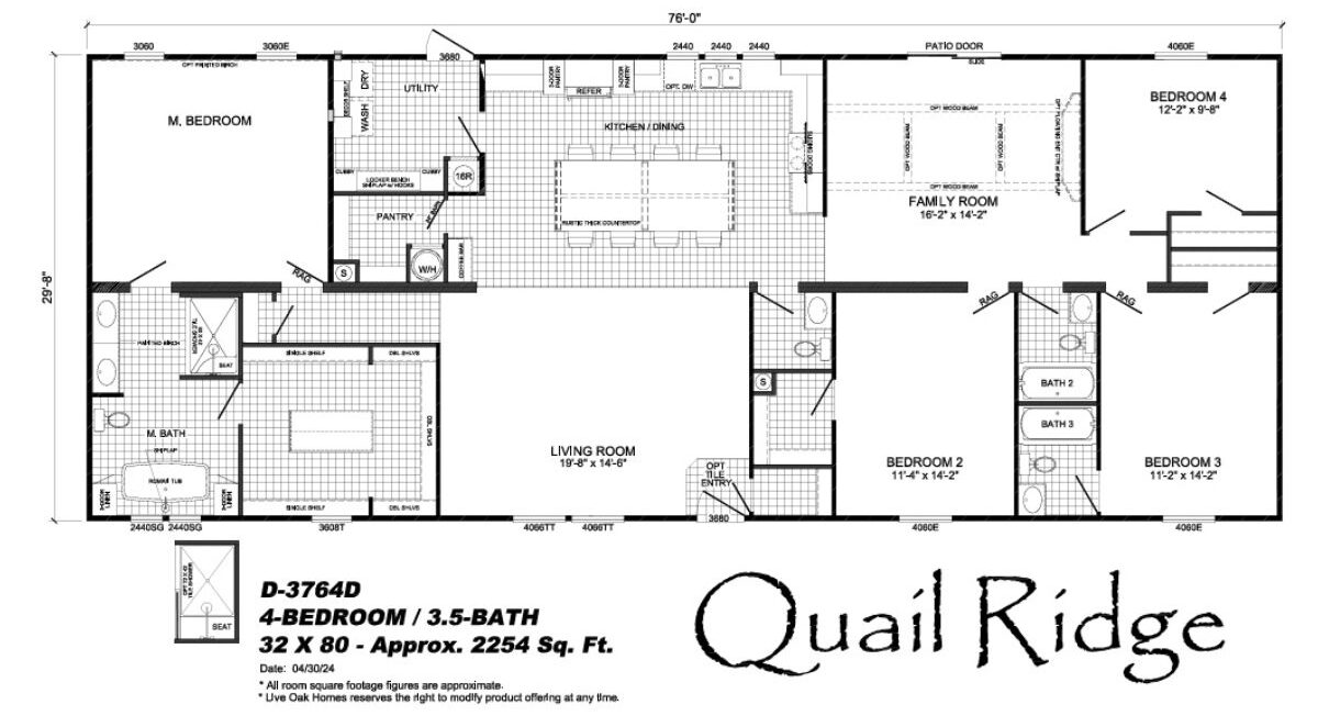 In StockThe Quail Ridge D-3764D by Live Oak Homes is a spacious, ranch-style manufactured home that offers 4 bedrooms and 3.5 bathrooms across approximately 2,254 square feet of living space. Designed as a two-section layout, this home blends generous room sizes with practical flow, making it ideal for both everyday family life and entertaining. With its classic ranch silhouette and thoughtfully planned interior, the Quail Ridge delivers comfort and versatility in a modern prefab package.